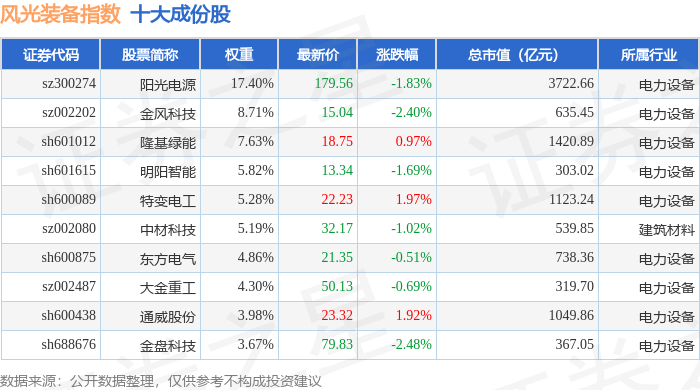 证券之星消息,12月1日,风光装备(980026)指数报收于1693.04点,跌0.45%,成交369.19亿元,换手率1.81%。当日该指数成份股中,上涨的有13家,禾望电气以8.11%的涨幅领涨,下跌的有17家,阿特斯以6.92%的跌幅领跌。