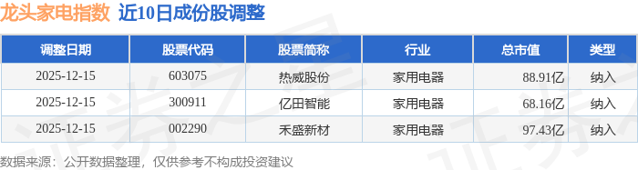 近10日内龙头家电(980028)指数成份股做了调整,新纳入了3只股票。