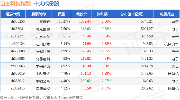 自主科技(980033)指数十大成份股详情如下: