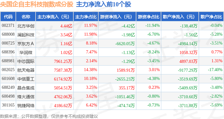 资金流向方面,央国企自主科技(980083)指数成份股当日主力资金净流入合计1.11亿元,游资资金净流出合计2.18亿元,散户资金净流入合计1.07亿元。成份股资金流向详情见下表:
