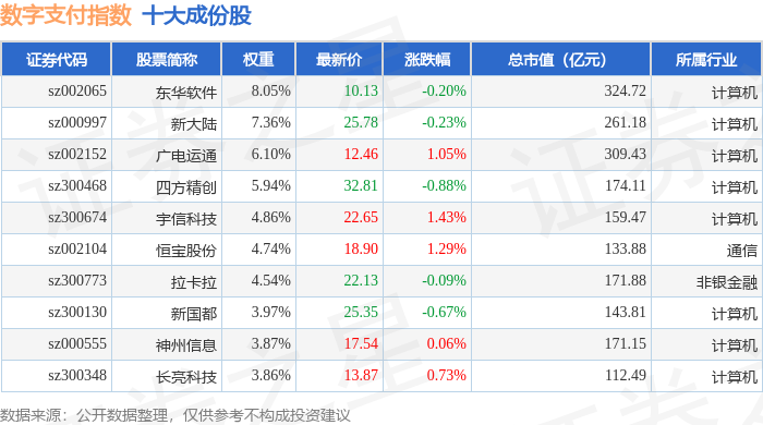 数字支付(980113)指数十大成份股详情如下: