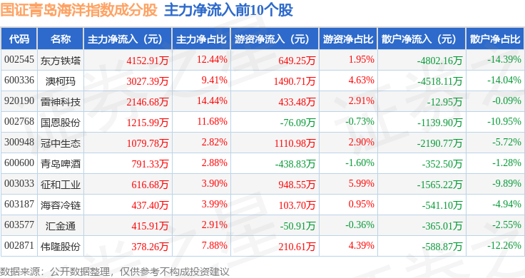 资金流向方面,国证青岛海洋(980532)指数成份股当日主力资金净流出合计3960.64万元,游资资金净流入合计2.16亿元,散户资金净流出合计1.45亿元。成份股资金流向详情见下表: