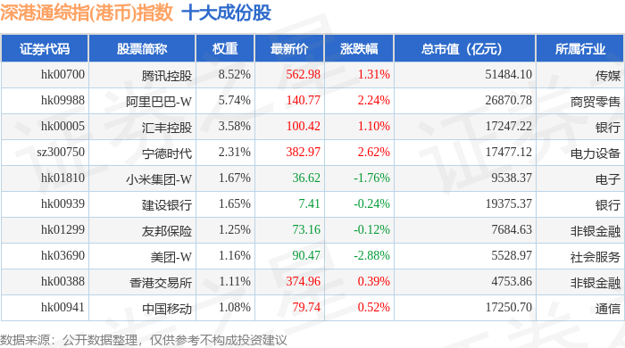 深港通综指(港币)(983006)指数十大成份股详情如下:
