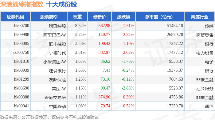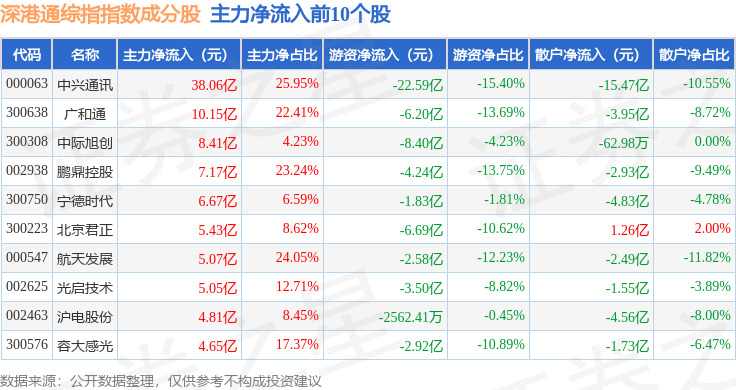 资金流向方面,深港通综指(983005)指数成份股当日主力资金净流入合计38.06亿元,游资资金净流出合计55.37亿元,散户资金净流入合计17.31亿元。成份股资金流向详情见下表: