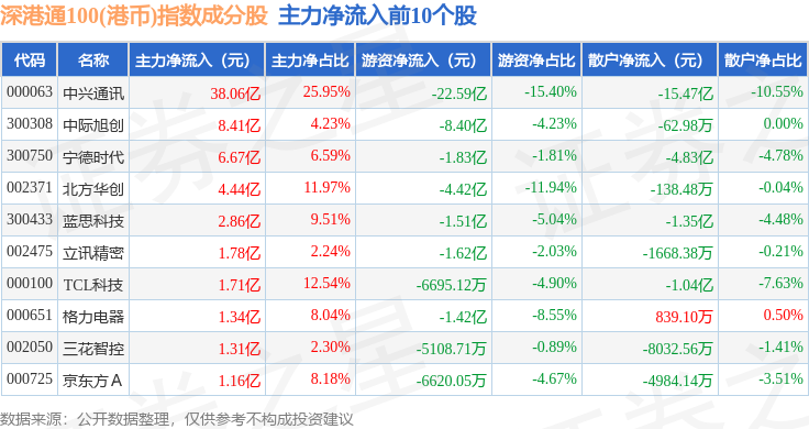 资金流向方面,深港通100(港币)(983008)指数成份股当日主力资金净流入合计33.75亿元,游资资金净流出合计35.1亿元,散户资金净流入合计1.36亿元。成份股资金流向详情见下表: