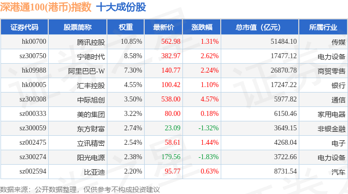 深港通100(港币)(983008)指数十大成份股详情如下: