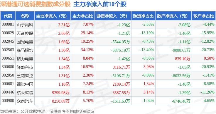 资金流向方面,深港通可选消费(983019)指数成份股当日主力资金净流出合计8.59亿元,游资资金净流出合计7.57亿元,散户资金净流入合计16.16亿元。成份股资金流向详情见下表:
