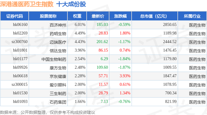 深港通医药卫生(983023)指数十大成份股详情如下: