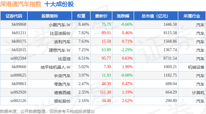 证券之星消息,12月1日,深港通汽车(983039)指数报收于7767.54点,涨0.44%,成交374.58亿元,换手率2.63%。当日该指数成份股中,上涨的有71家,众泰汽车以7.56%的涨幅领涨,下跌的有24家,豪恩汽电以5.2%的跌幅领跌。