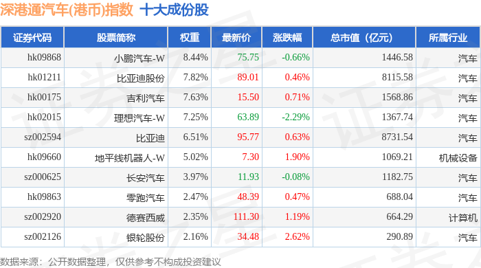 深港通汽车(港币)(983040)指数十大成份股详情如下:
