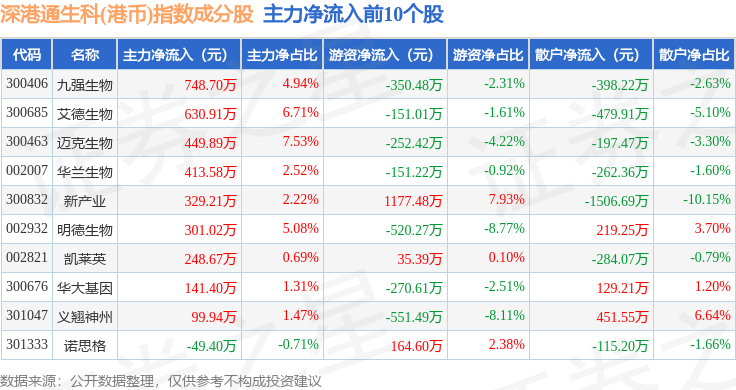 资金流向方面,深港通生科(港币)(983060)指数成份股当日主力资金净流出合计1.99亿元,游资资金净流入合计6150.21万元,散户资金净流入合计1.38亿元。成份股资金流向详情见下表: