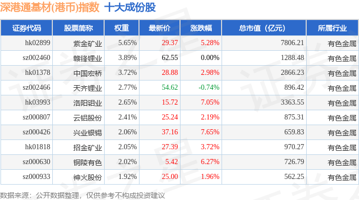 深港通基材(港币)(983062)指数十大成份股详情如下: