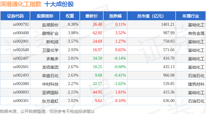 证券之星消息,12月1日,深港通化工(983063)指数报收于5857.65点,涨0.77%,成交508.8亿元,换手率2.24%。当日该指数成份股中,上涨的有75家,容大感光以17.86%的涨幅领涨,下跌的有40家,凯盛新材以3.4%的跌幅领跌。