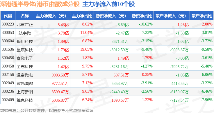 资金流向方面,深港通半导体(港币)(983068)指数成份股当日主力资金净流入合计20.29亿元,游资资金净流出合计10.35亿元,散户资金净流出合计9.94亿元。成份股资金流向详情见下表: