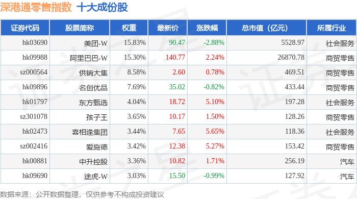 证券之星消息,12月1日,深港通零售(983073)指数报收于2306.03点,涨0.58%,成交269.85亿元,换手率1.75%。当日该指数成份股中,上涨的有16家,天音控股以9.97%的涨幅领涨,下跌的有14家,狮腾控股以10.88%的跌幅领跌。