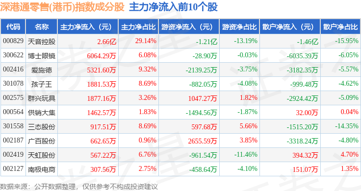 资金流向方面,深港通零售(港币)(983074)指数成份股当日主力资金净流入合计3.18亿元,游资资金净流出合计1.01亿元,散户资金净流出合计2.17亿元。成份股资金流向详情见下表: