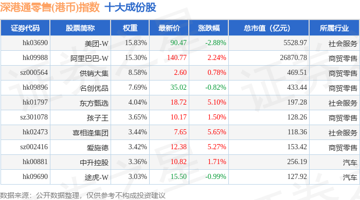 深港通零售(港币)(983074)指数十大成份股详情如下: