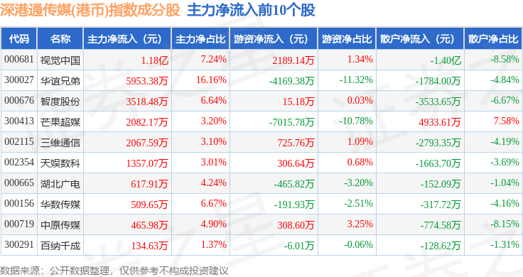 资金流向方面,深港通传媒(港币)(983076)指数成份股当日主力资金净流出合计18.51亿元,游资资金净流入合计1.1亿元,散户资金净流入合计17.41亿元。成份股资金流向详情见下表: