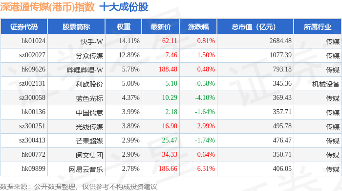 深港通传媒(港币)(983076)指数十大成份股详情如下: