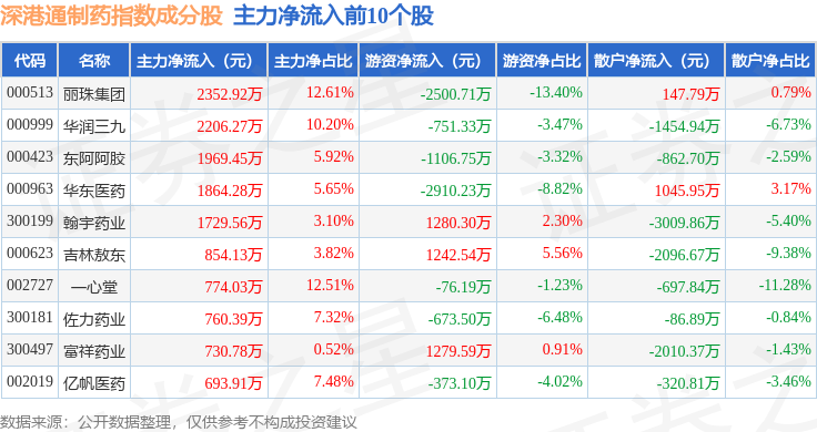 资金流向方面,深港通制药(983079)指数成份股当日主力资金净流出合计8.12亿元,游资资金净流入合计3.12亿元,散户资金净流入合计4.99亿元。成份股资金流向详情见下表:
