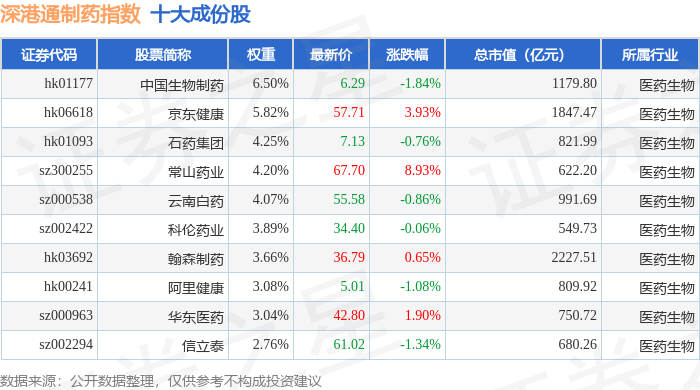 证券之星消息,12月1日,深港通制药(983079)指数报收于4788.48点,涨0.61%,成交258.42亿元,换手率1.32%。当日该指数成份股中,上涨的有64家,海王生物以10.0%的涨幅领涨,下跌的有31家,海南海药以4.1%的跌幅领跌。