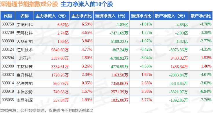 资金流向方面,深港通节能(983085)指数成份股当日主力资金净流出合计13.36亿元,游资资金净流入合计8.52亿元,散户资金净流入合计4.84亿元。成份股资金流向详情见下表: