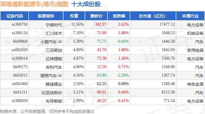 深港通新能源车(港币)(983088)指数十大成份股详情如下: