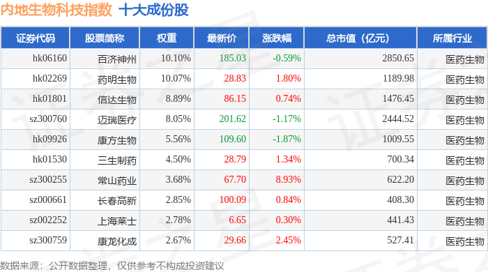 证券之星消息,12月1日,内地生物科技(983101)指数报收于3068.82点,涨0.42%,成交135.51亿元,换手率0.79%。当日该指数成份股中,上涨的有37家,常山药业以8.93%的涨幅领涨,下跌的有11家,百普赛斯以3.65%的跌幅领跌。