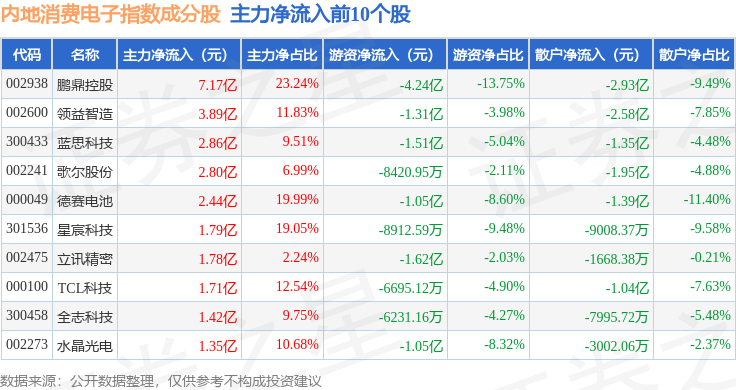资金流向方面,内地消费电子(983105)指数成份股当日主力资金净流入合计15.35亿元,游资资金净流出合计5.45亿元,散户资金净流出合计9.9亿元。成份股资金流向详情见下表: