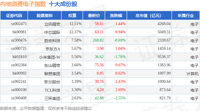 证券之星消息,12月1日,内地消费电子(983105)指数报收于4676.76点,涨1.05%,成交801.11亿元,换手率1.73%。当日该指数成份股中,上涨的有41家,德赛电池以10.0%的涨幅领涨,下跌的有9家,美图公司以5.12%的跌幅领跌。