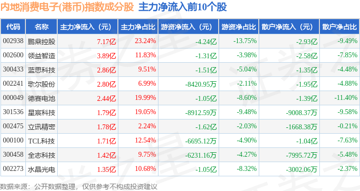 资金流向方面,内地消费电子(港币)(983106)指数成份股当日主力资金净流入合计15.35亿元,游资资金净流出合计5.45亿元,散户资金净流出合计9.9亿元。成份股资金流向详情见下表: