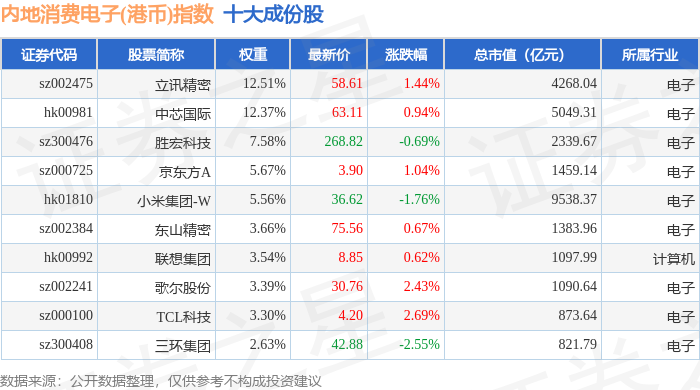 内地消费电子(港币)(983106)指数十大成份股详情如下: