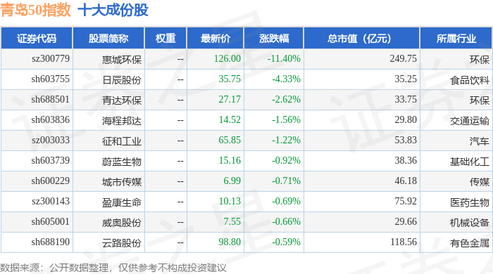 青岛50(989011)指数十大成份股详情如下: