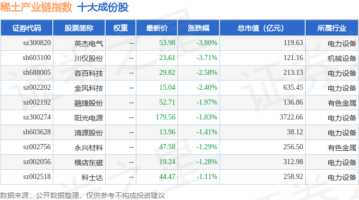稀土产业链(989013)指数十大成份股详情如下: