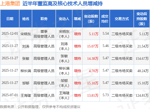 上港集团近半年内的董监高及核心技术人员增减持详情如下: