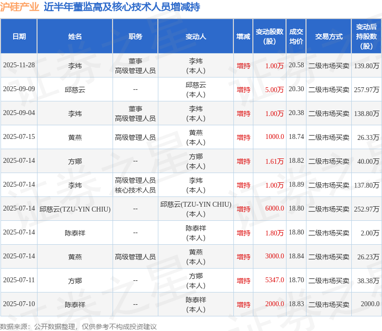 沪硅产业近半年内的董监高及核心技术人员增减持详情如下: