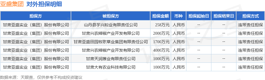 亚盛集团11月28日披露6笔对外担保,被担保公司5家。对外担保明细如下表: