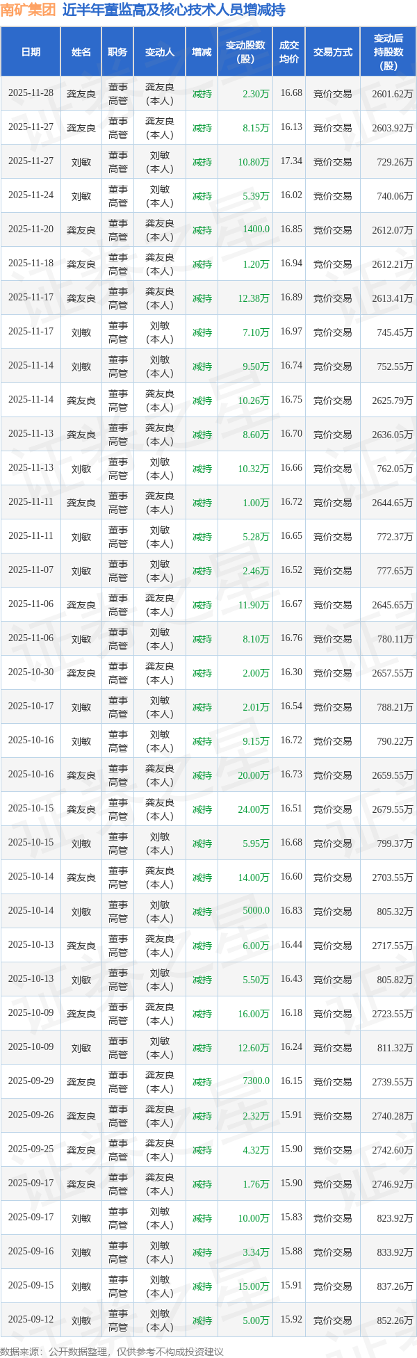 南矿集团近半年内的董监高及核心技术人员增减持详情如下: