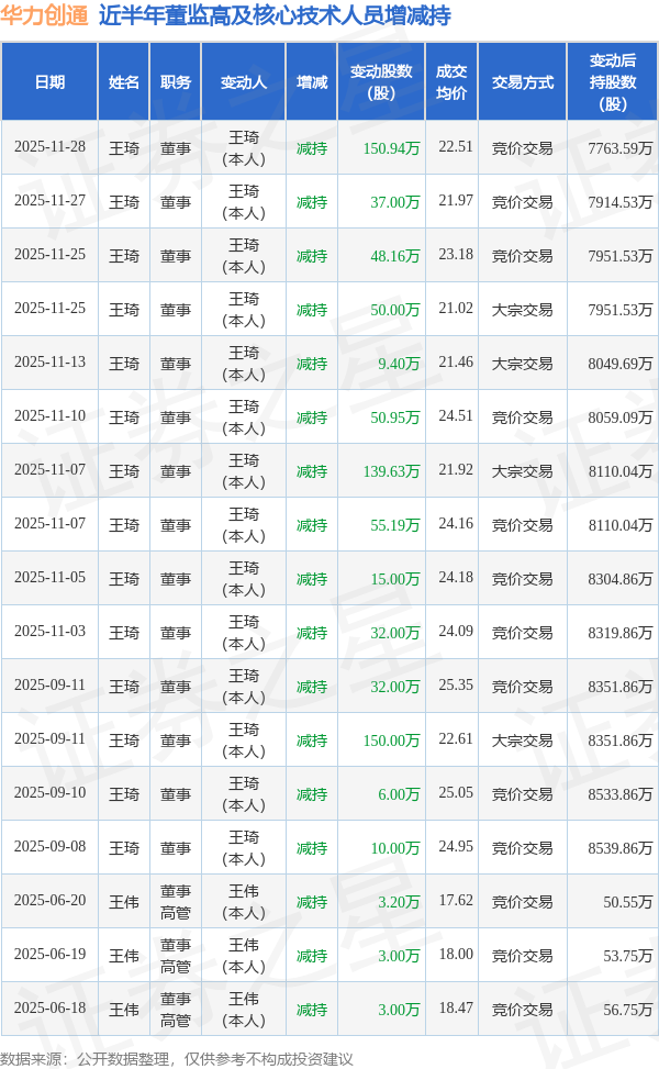 华力创通近半年内的董监高及核心技术人员增减持详情如下: