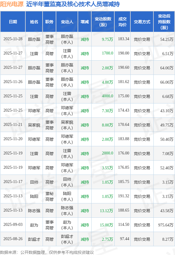 阳光电源近半年内的董监高及核心技术人员增减持详情如下: