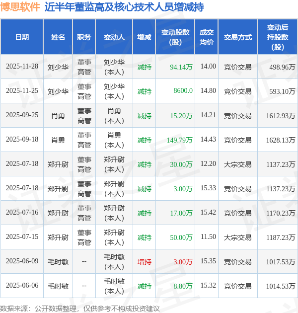 博思软件近半年内的董监高及核心技术人员增减持详情如下: