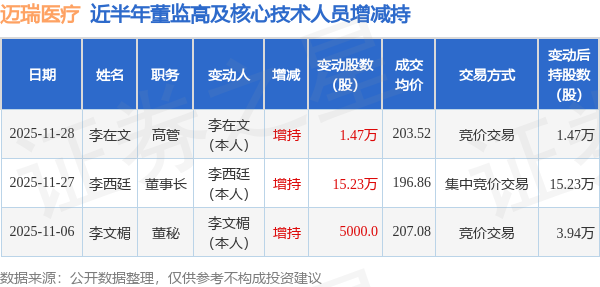证券之星消息,根据12月1日市场公开信息、上市公司公告及交易所披露数据整理,迈瑞医疗(300760)最新董监高及相关人员股份变动情况:2025年11月28日公司高管李在文共增持公司股份1.47万股,占公司总股本为0.0012%。变动期间公司股价上涨3.93%,11月28日当日收盘报204.01元。