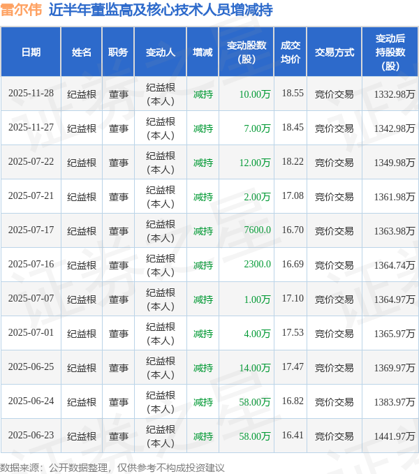 雷尔伟近半年内的董监高及核心技术人员增减持详情如下:
