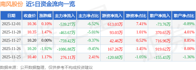证券之星消息,截至2025年12月1日收盘,南风股份(300004)报收于10.36元,上涨0.1%,换手率1.67%,成交量8.0万手,成交额8269.93万元。