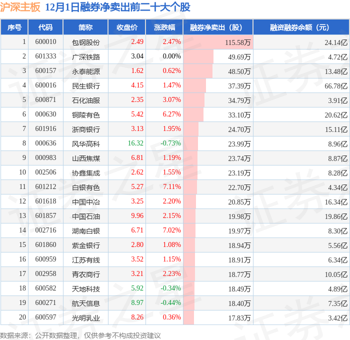 沪深主板融券净卖出前三分别为:包钢股份(600010)融券净卖出115.58万股、广深铁路(601333)融券净卖出49.69万股、永泰能源(600157)融券净卖出48.5万股,前20具体见下表: