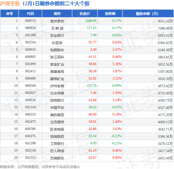 沪深主板融券余额前三分别为:贵州茅台(600519)融券余额8551.16万元、五 粮 液(000858)融券余额7588.08万元、农业银行(601288)融券余额6993.01万元,前20具体见下表: