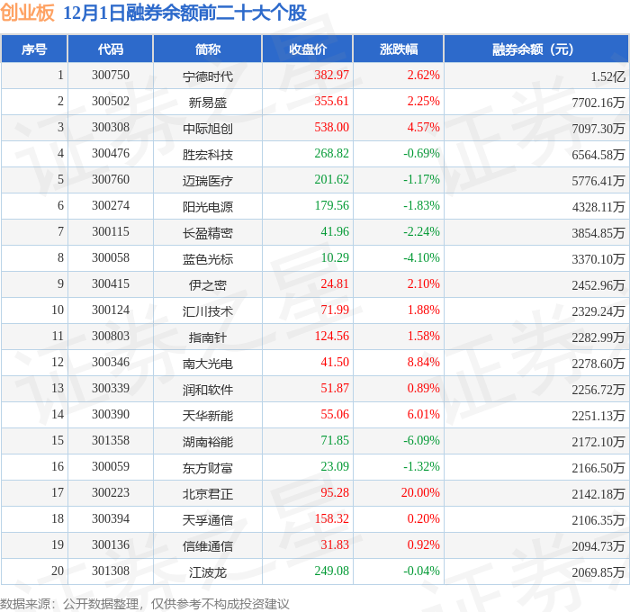 创业板融券余额前三分别为:宁德时代(300750)融券余额1.52亿元、新易盛(300502)融券余额7702.16万元、中际旭创(300308)融券余额7097.3万元,前20具体见下表: