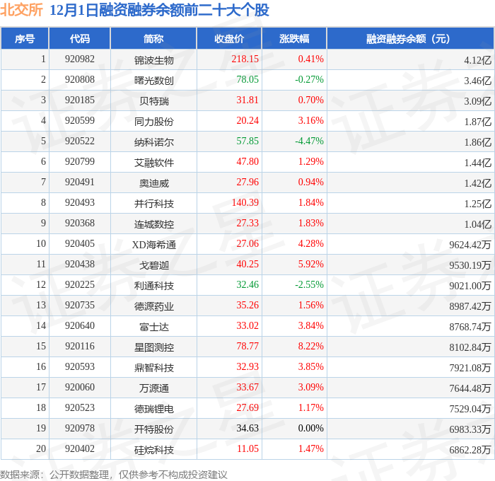 北交所融资融券余额前三分别为:锦波生物(920982)融资融券余额4.12亿元、曙光数创(920808)融资融券余额3.46亿元、贝特瑞(920185)融资融券余额3.09亿元,前20具体见下表: