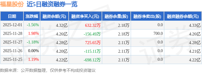 福星股份融资融券信息显示,融资方面,当日融资买入1234.59万元,融资偿还602.27万元,融资净买入632.32万元。融券方面,融券卖出0.0股,融券偿还0.0股,融券余量2.18万股,融券余额5.52万元。融资融券余额4.33亿元。