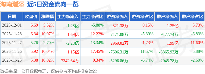 证券之星消息,截至2025年12月1日收盘,海南瑞泽(002596)报收于6.69元,上涨5.52%,换手率28.52%,成交量326.98万手,成交额21.81亿元。